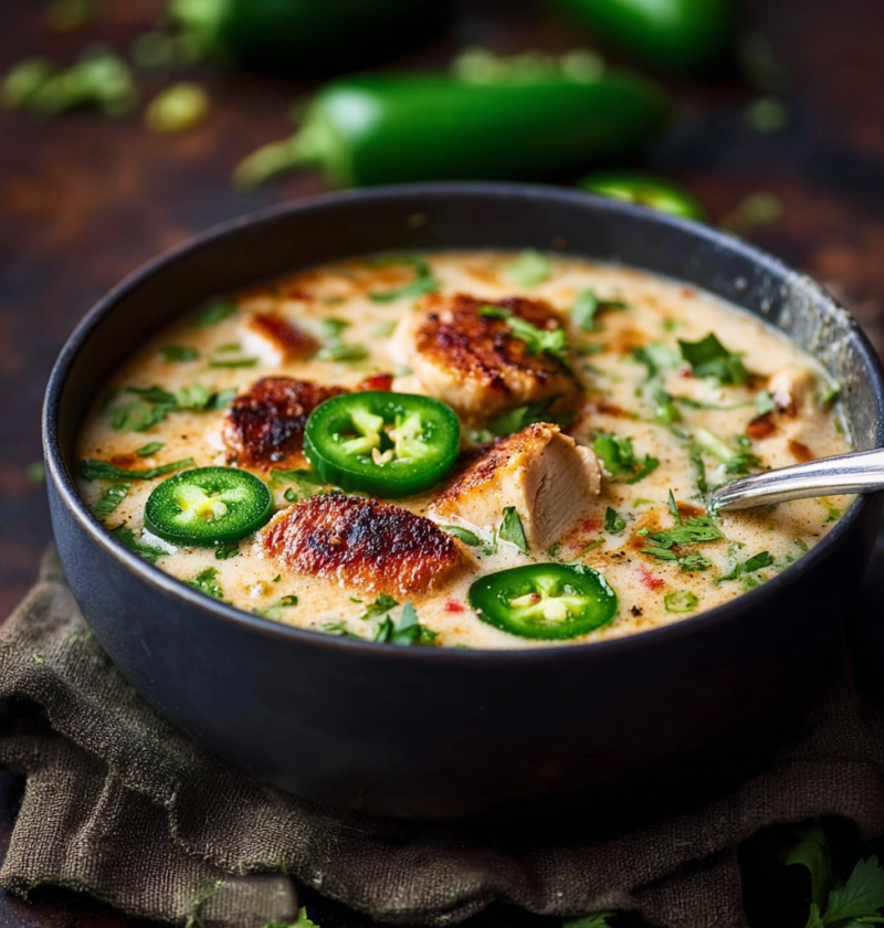 Enjoy the Smoky Jalapeño Popper Soup with Grilled Chicken hot, savoring the creamy texture and bold flavors in every spoonful.